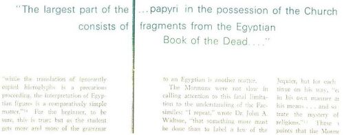 "...The largest part of the Joseph Smith Papyri in the possession of the Church consists of fragments from the Egyptian Book of the Dead, the fragments having been recently translated and discussed by no less a scholar than Professor John A. Wilson." (p. 57)