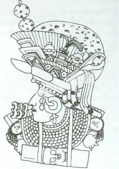 Mayan headdress and “pectoral” [chest or breastplate] hung or attached around the neck.