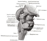 [[Image:Brain_1.gif|thumb|right|The human brain. The midbrain is located at the level marked 'cerebral peduncle'. From: Henry Gray, ''Anatomy of the Human Body'', 1918, Fig 677. {{link|url=http://www.bartleby.com/107/illus677.html}}.]] | [[Image:Brain_1.gif|thumb|right|The human brain. The midbrain is located at the level marked 'cerebral peduncle'. From: Henry Gray, ''Anatomy of the Human Body'', 1918, Fig 677. {{link|url=http://www.bartleby.com/107/illus677.html}}.]] | ||